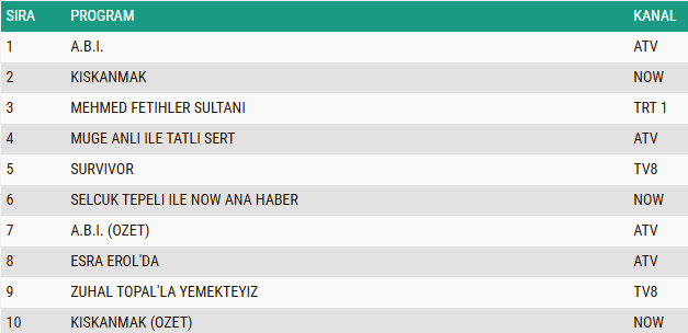 10 Şubat 2026 Salı gününe ait AB reyting sonuçlarında zirvenin sahibi “A.B.İ.” dizisi oldu ve hedef kitlede elde ettiği güçlü izlenme oranıyla günü ilk sırada tamamladı. Onu, dikkat çeken hikayesi ve dramatik anlatımıyla izleyiciyi ekran başına kilitleyen “Kıskanmak” dizisi ikinci sıradan takip ederken, tarihî atmosferi ve yüksek prodüksiyon kalitesiyle ön plana çıkan “Mehmed: Fetihler Sultanı” dizisi ise üçüncü basamakta yer aldı.