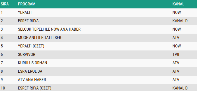 11 Şubat 2026 tarihli ABC1 reyting sonuçlarında da tablo değişmedi ve “Yeraltı” isimli yeni dizi zirvedeki yerini koruyarak günü ilk sırada tamamladı. Geniş izleyici kitlesine hitap eden yapım, ABC1 grubunda da en çok tercih edilen program oldu. Onu, dikkatleri üzerine çeken senaryosu ve güçlü oyuncu performanslarıyla ön plana çıkan “Eşref Rüya” dizisi ikinci sıradan takip ederken, uzun yıllardır gündüz kuşağında istikrarlı bir başarı grafiği çizen “Müge Anlı ile Tatlı Sert” sabah programı ise üçüncü basamakta yer aldı.