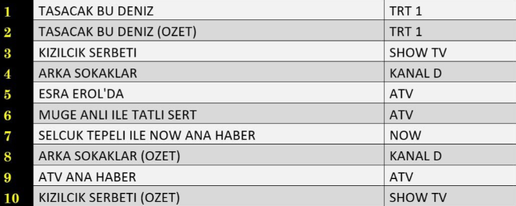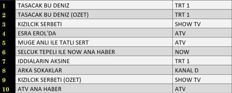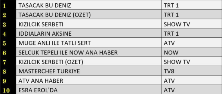 ABC1 izleyici grubunda da zirvede değişiklik yaşanmadı ve “Taşacak Bu Deniz” isimli başarılı yapım, güçlü hikâyesi ve sadık izleyici kitlesinin desteğiyle günün en çok izlenen dizisi olmayı sürdürdü. Dizinin ana bölümünün ardından ekrana gelen özet bölümü, yüksek izlenme oranlarıyla listede ikinci sıraya yerleşerek yapımın başarısını pekiştirdi. Cuma akşamlarının iddialı yapımlarından biri olan ve dört sezondur ilgiyle izlenen dizi “Kızılcık Şerbeti” ise yoğun rekabetin yaşandığı gecede üçüncü sırada kendine yer bulurken, ortaya çıkan tablo ABC1 grubunda izleyici tercihlerinin büyük ölçüde dram ağırlıklı yapımlardan yana olduğunu bir kez daha göstermiş oldu. Taşacak Bu Deniz ve Kızılcık Şerbeti gibi iki başarılı yapımın rekabeti takip etmeye değerdi.