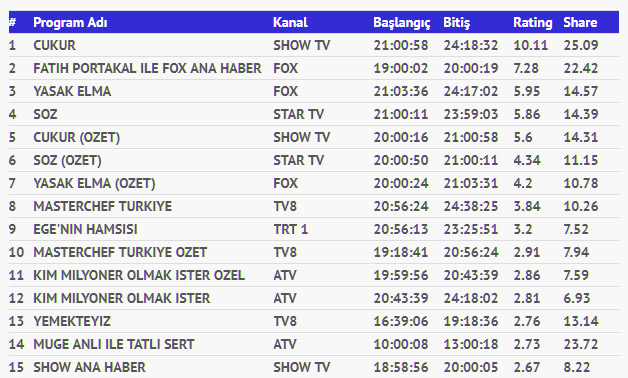 Dün #babam etiketiyle sosyal medyada da adından söz ettirmeyi başaran Çukur, total’de 10,43 izlenme oranı, ab’de ise 10,11 izlenme oranıyla, tüm kategorilerde günü birinci sırada tamamlamayı başardı.