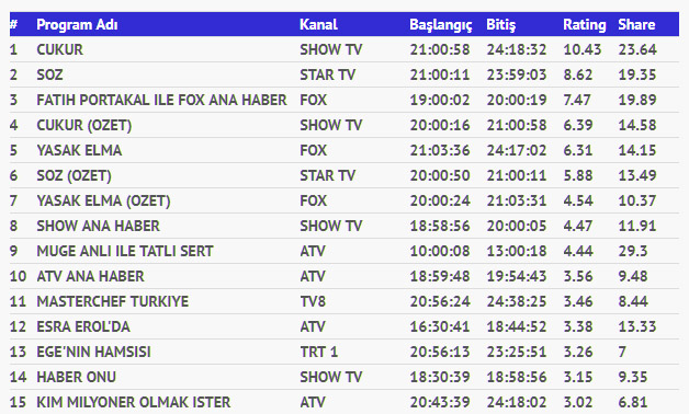 12 Kasım Pazartesi Reyting Sonuçları