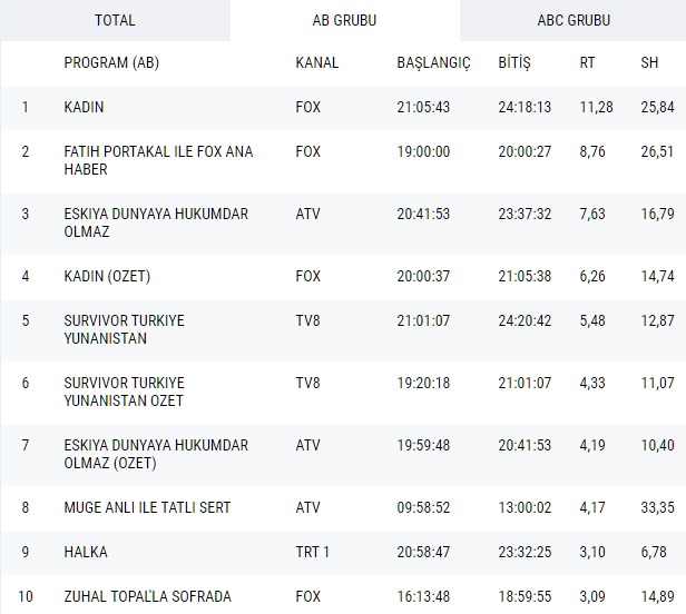 AB grubunda ise Total grubuna göre değişiklik göstermeden, Kadın dizisi yeni bölümü ile ilk sırada, özet bölümü ile de üçüncü sırada yer almayı başarmıştı. İkinci sırada ise Fatih Portakal İle Fox Ana Haber programı yer almıştı.