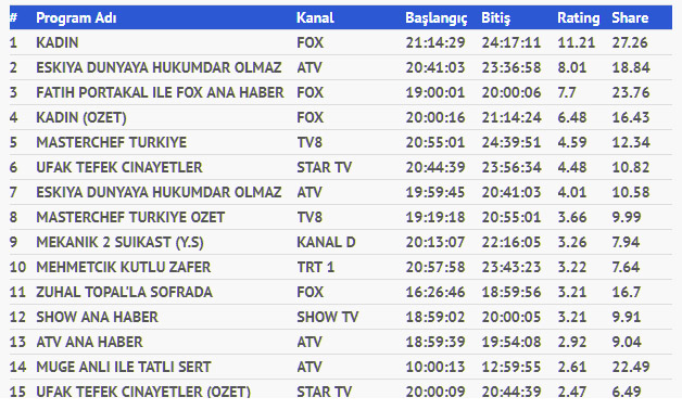Geçen hafta tüm reyting kategorilerinde birinci sırada yer alan Fox ekranlarının sevilen dizisi Kadın, liderliğini bu haftada sürdürdü. En yakın rakibi Eşkiya Dünyaya Hükümdar Olmaz dizisine her iki gruptada büyük fark atmayı başaran dizi tüm reyting kategorilerinde birinci sırada yer aldı.