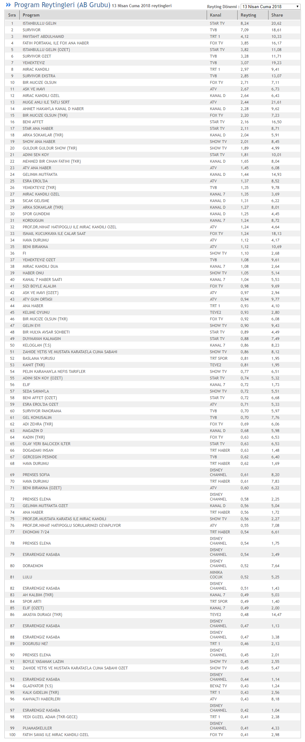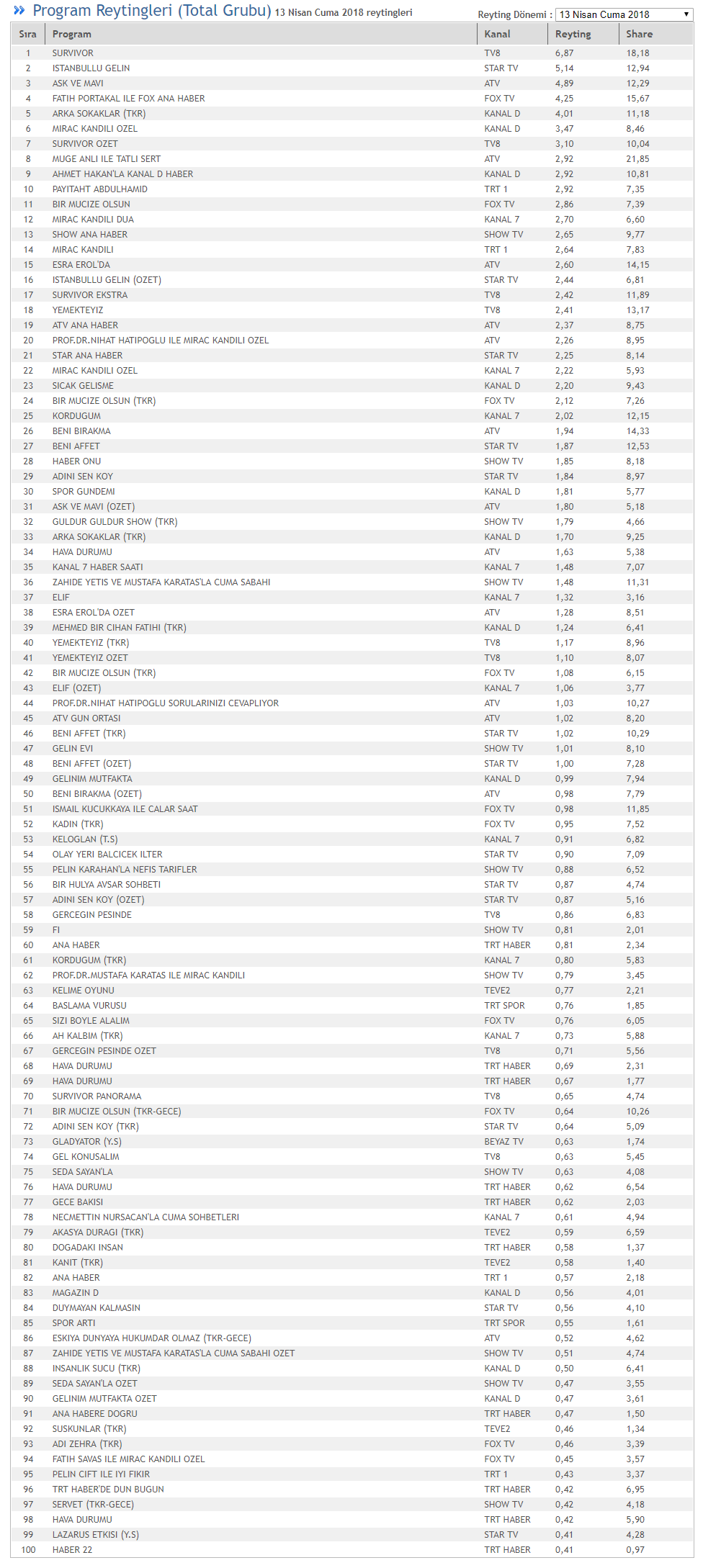 13 Nisan Cuma 2018 reytinlerine göre TOTAL'de en çok izlenen program 6,87 reyting 18,18 share oranıyla TV8'de yayınlanan Survivor olurken, ikinci sırada İstanbullu Gelin, üçüncü sırada Aşk ve Mavi, dördüncü sırada, Fatih Portakal ile Fox Ana Haber, beşinci sırada Arka Sokaklar (TKR) bölümü yer aldı.