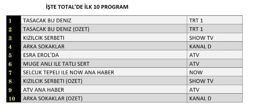 13 Şubat 2026 Cuma gününe ait reyting verileri kamuoyuyla paylaşıldı ve Total grubunda gecenin kazananı “Taşacak Bu Deniz” dizisi oldu. Yayınlandığı saat diliminde izleyiciden yoğun ilgi gören yapım, aldığı yüksek izlenme oranlarıyla zirveye yerleşti. Dizinin tekrar bölümü olan “Taşacak Bu Deniz (Özeti)” ise güçlü performansını sürdürerek ikinci sırada kendine yer buldu. Gecenin iddialı yapımlarından “Kızılcık Şerbeti” dizisi de elde ettiği izlenme oranıyla üçüncü basamakta yer alarak Cuma akşamı ekranlardaki rekabetin ne denli çekişmeli geçtiğini bir kez daha ortaya koydu.
