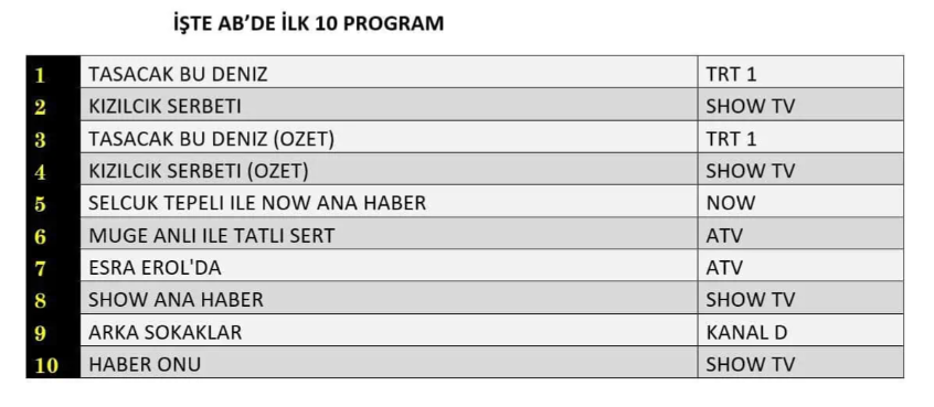 AB izleyici grubunda da tablo değişmedi ve “Taşacak Bu Deniz” dizisi güçlü hikâyesi ile dikkat çeken sahneleri sayesinde zirvedeki yerini korumayı başardı. Duygusal temposu ve merak uyandıran gelişmeleriyle ekran başındaki izleyiciyi kendine bağlayan yapım, haftanın en çok konuşulan projelerinden biri olarak birinciliğe yerleşti. Taşacak Bu Deniz'i, sürükleyici anlatımı ve karakterler arasındaki gerilimi artıran son bölümüyle “Kızılcık Şerbeti” dizisi takip ederek ikinci sırada yer aldı. Listenin üçüncü basamağında ise dizinin kaçıranlar ve yeniden izlemek isteyenler için ekranlara gelen “Taşacak Bu Deniz (Özeti)” bulunurken, özet bölümün dahi üst sıralarda kendine yer bulması yapımın AB grubundaki istikrarlı başarısını bir kez daha gözler önüne serdi.