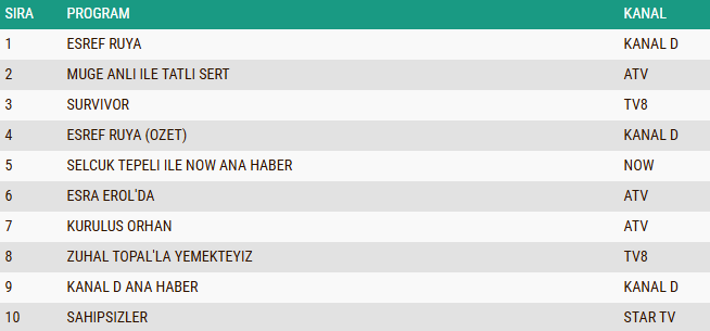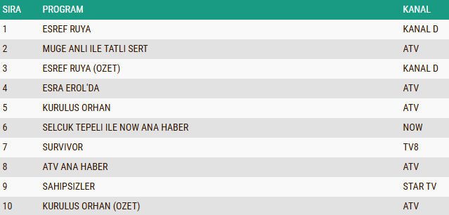 AB izleyici grubunda da reyting rekabeti dikkat çekerken, “Eşref Rüya” dizisi yayınlanan bölümüyle listenin zirvesine yerleşti. Başarılı performansını devam ettiren yapım, AB kategorisinde günü birinci sırada tamamlamışken, gündüz kuşağının sevilen programlarından “Müge Anlı ile Tatlı Sert” sabah programı ikinci sıraya yükseldi. Uzun soluklu yarışma programı “Survivor” ise istikrarlı izlenme oranlarıyla üçüncü basamakta yer alarak ilk üçte kendine yer buldu.