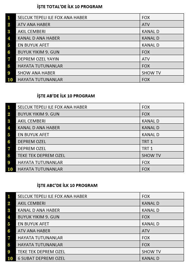 6 Şubat'ta meydana gelen Kahramanmaraş üssü iki büyük depremden sonra tüm televizyonlar tüm yayınlarını iptal ederek deprem özel yayını yapıyor. 10 şehrimizi adeta savaş alanına çeviren ve 9 saat arayla yaşanan 7.7 ve 7.6'lık depremlerin ardından bölgeden yapılan canlı yayınlar reyting listelerinde zirveye yerleşti.