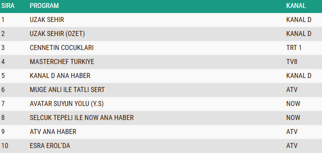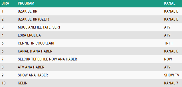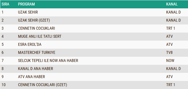ABC1 grubunda da liderlik el değiştirmedi. Türk televizyon ekranlarında ekranlarında iki sezondur yayınlanan “Uzak Şehir” dizisi, gün boyunca elde ettiği yüksek izlenme oranlarıyla birinci sırada yer alarak başarısını sürdürdü. Dizinin merak uyandıran sahnelerini yeniden ekrana taşıyan özet bölümü, izleyicinin ilgisini koruyarak ikinci sıraya yerleşti. Duygusal anlatımı ve güçlü oyuncu kadrosuyla dikkatleri üzerine çeken yeni sezon dizisi “Cennetin Çocukları” ise üçüncü sırada yer alarak ABC1 kategorisinde günün ön plana çıkan yapımları arasında yer almayı başardı.