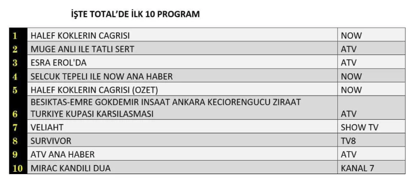 Total izleyici grubunda günün en çok izlenen yapımı “Halef: Köklerin Çağrısı” isimli fenomen dizi oldu ve zirvenin sahibi olarak dikkat çekti. Yayınlanan bölümüyle geniş bir izleyici kitlesine ulaşan dizi, Total kategorisinde birinci sırayı alarak başarısını sürdürdü. Uzun yıllardır gündüz kuşağının güçlü yapımları arasında yer alan “Müge Anlı ile Tatlı Sert” sabah programı, yüksek izlenme oranlarıyla ikinci sıraya yerleşirken; “Esra Erol’da” gündüz kuşağı programı ise istikrarlı performansını koruyarak günü üçüncü sırada tamamladı.