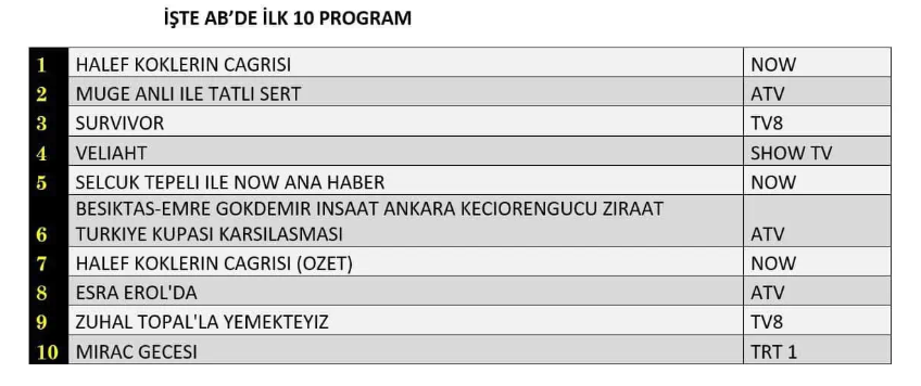 AB izleyici grubunda da reyting yarışının kazananı “Halef: Köklerin Çağrısı” dizisi oldu. Yayınlanan bölümüyle dikkat çeken yapım, AB kategorisinde zirveye yerleşerek günü birinci sırada tamamladı. Gündüz kuşağının güçlü ve istikrarlı programlarından “Müge Anlı ile Tatlı Sert” sabah programı, yüksek izlenme oranlarıyla ikinci sırada kendine yer bulurken; uzun soluklu yarışma programı “Survivor” ise geniş izleyici kitlesiyle üçüncü basamakta yer alarak ilk üçteki yerini aldı.