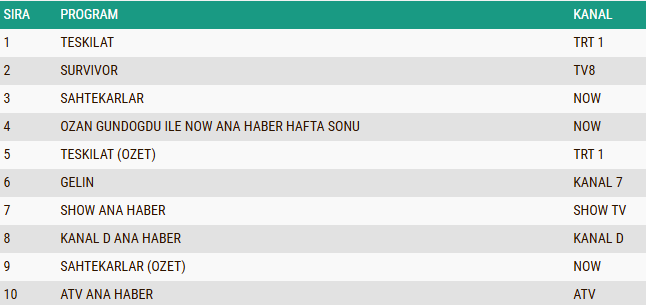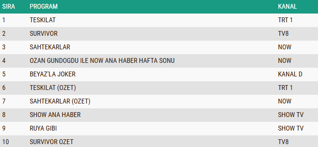 AB izleyici kategorisinde de zirve değişmedi ve “Teşkilat” dizisi güçlü hikâyesi ile temposu yüksek sahneleri sayesinde ilk sıradaki yerini aldı. Geniş bir izleyici kitlesini ekran başına toplayan yapım, AB grubunda da gecenin en çok tercih edilen programı olmayı başardı. Onu, rekabet dolu parkurları ve ada konseyindeki heyecanıyla dikkatleri üzerine çeken yarışma programı “Survivor” ikinci sıradan takip etti. Üçüncü basamakta ise dramatik anlatımı ve merak uyandıran gelişmeleriyle “Sahtekarlar” dizisi yer alarak AB grubunda ilk üçte kendine yer buldu.