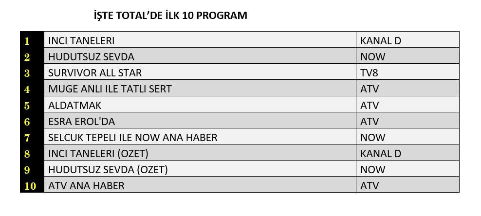 Total izleyici kategorisinde listenin ikinci sırasında Now dizisi ‘Hudutsuz Sevda’ yer aldı. Tv8'de yayınlanan ‘Survivor All Star’ üçüncü, Atv'de yayınlanan ‘Müge Anlı ile Tatlı Sert’ dördüncü, ‘Aldatmak’ dizisi ise beşinci sırada yer alan yapım oldu.