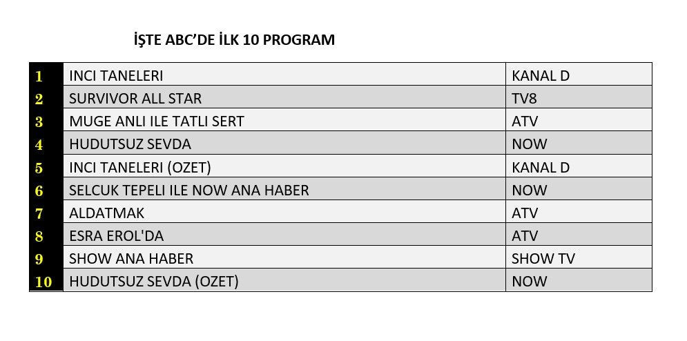 TİAK (Televizyon İzleme Araştırmaları Komitesi) tarafından alınan karar doğrultusunda, reyting sonuçlarının detaylarını ve ilk 100 program sıralamasını yayınlayamıyoruz.