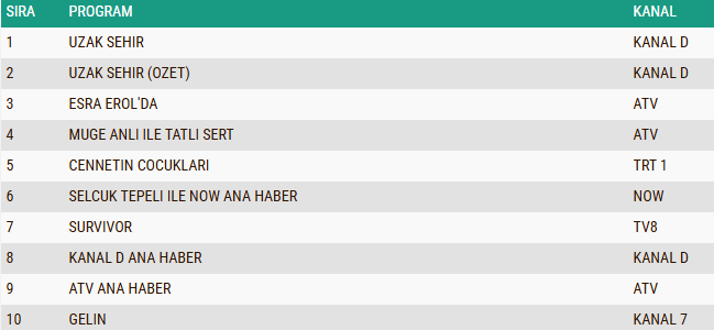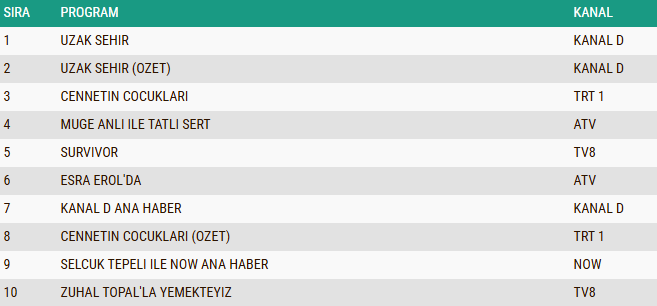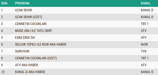 ABC1 kategorisinde de günün lideri değişmedi ve “Uzak Şehir” dizisi yeni bölümüyle zirvede yer aldı. Geniş izleyici kitlesini ekran başına toplayan yapım, bu grupta da en çok tercih edilen program olmayı başardı. Dizinin özet bölümü ise güçlü performansını devam ettirerek ikinci sıraya yerleşti. Üçüncü basamakta ise hikâyesiyle dikkatleri üzerine çeken “Cennetin Çocukları” dizisi bulunurken, ABC1 grubunda ortaya çıkan sıralama Pazartesi akşamı ekran rekabetinin hangi yapımlar etrafında şekillendiğini bir kez daha göstermiş oldu.