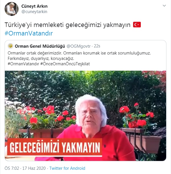 Ülkemiz 3 yanı denizlerle çevrili, üçte biri ormanlardan oluşan muhteşem bir coğrafya. Buna rağmen her geçen yıl artan orman yangınları önlenemiyor. Adeta ciğerlerimiz yakan bu yangınlara karşı Orman Bakanlığı ses getiren bir kampanya başlattı. Ülkemizdeki orman varlıklarının korunması için 181 yıldır çalışan Orman Genel Müdürlüğü’nün amacı, yüzde 90 oranında insan kaynaklı olan orman yangınları konusunda toplumda farkındalık oluşturmak.7’den 77’ye herkese ulaşmak için reklam kampanyasına davet ettiği isimlerden ilk önce Cüneyt Arkın destek verdi. Abi konumundaki Cüneyt Arkın’ın deçağrısına sanat camiasından 15 ünlü daha katıldı ve reklam filminde yer aldı. T.C. Tarım ve Orman Bakanlığı önderliğinde 17 Haziran’da İzmir’de gerçekleşen basın toplantısında tanıtımı yapılan kampanyaya katılanlara Tarım ve Orman Bakanı Bekir Pakdemirli şu sözlerle şükranlarını iletti. “Sanat dünyasının değerli üyelerine verdikleri desteklerden ötürü teşekkürlerimi sunarım”