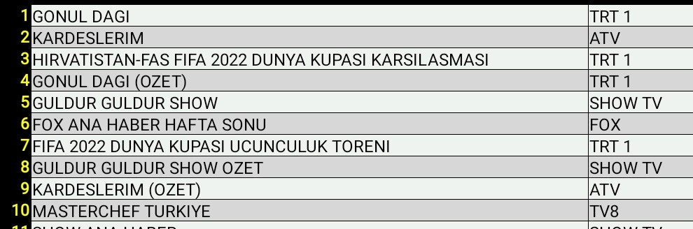 “Gönül Dağı”nın ardından Total ve +20ABC grubunda “Kardeşlerim” dizisi yer alırken AB grubunda Hırvatistan-Fas 2022 Dünya Kupası Karşılaşması yer aldı.