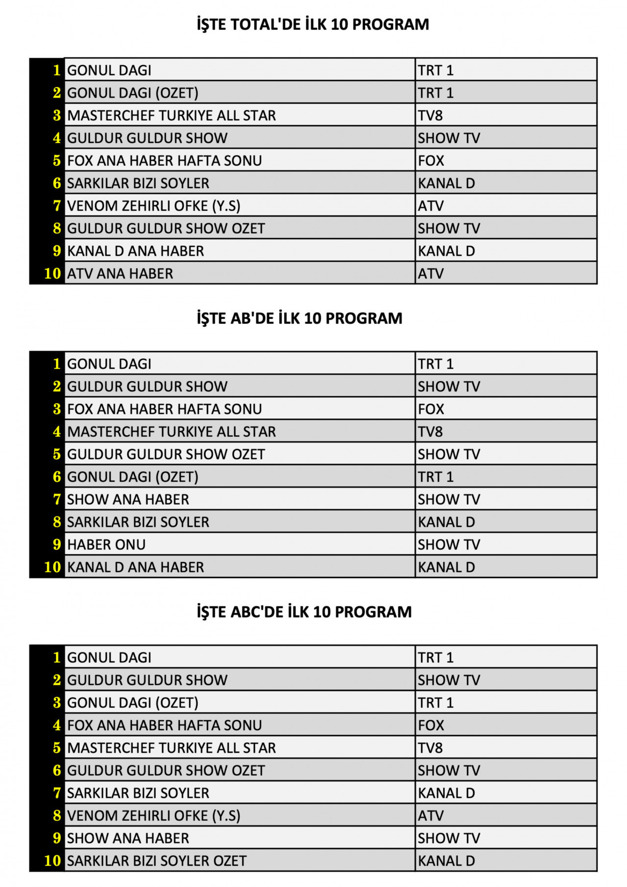 Bir Anadolu Hikayesi repliğiyle her cumartesi izleyiciyle buluşan Gönül Dağı'nın ilk sırada yer aldığı Total’de 2. sırada “Gönül Dağı” özet bölümü, 3. sırada ise TV8’de yayınlanan “MasterChef Türkiye All Star” programı yer aldı. Bir başka reyting ölçümü olan AB’de 1. sırada “Gönül Dağı”, 2. sırada “Güldür Güldür Show”, 3. sırada ise “FOX Ana Haber Hafta Sonu” yer aldı. 20ABC ölçümlerinde de sıralama değişmedi ve “Gönül Dağı”, 2. sırada “Güldür Güldür Show”, 3. sırada ise “FOX Ana Haber Hafta Sonu” yer aldı.