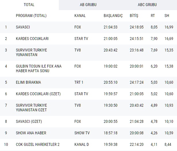 17 Şubat Pazar günü reyting sonuçlarına göre Total grupta, Fox tv ekranlarının başarılı dizisi Savaşçı, 16,99 share ile ilk sırada yer alırken, Star Tv ekranlarının sevilen dizisi Kardeş Çocukları 16,69 share ile ikinci sırada yer aldı. Üçüncü sırada ise Tv 8 ekranlarının başarılı yarışma programı Survivor Türkiye - Yunanistan 15,35 share ile yer aldı.