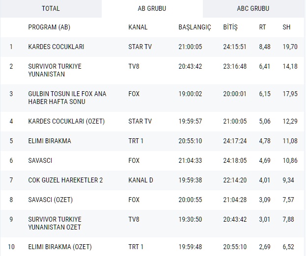 17 Şubat Pazar 2019 reyting sonuçları AB grupta ise, Star tv kanalında Kardeş Çocukları dizisi ilk sırada, Tv 8 kanalının başarılı yarışması Survivor Türkiye - Yunanistan ikinci sırada, Kanal D ekranlarının dizisi Çok Güzel Hareketler 2 programı ise üçüncü sırada yer almıştı.