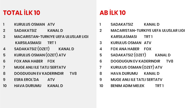 AB kategorisinde ise günü birinci sırada tamamlayan dizi/program 'Sadakatsiz' oldu. 'Macaristan - Türkiye' karşılaşması günü ikinci sırada tamamlarken, 'Kuruluş Osman' üçüncü sırada yer aldı.