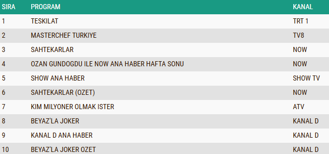 AB izleyici grubunda da gecenin en çok izlenen yapımı “Teşkilat” dizisi oldu. Yayınlanan bölümüyle güçlü bir performans sergileyen dizi, AB kategorisinde zirveye yerleşerek günü birinci sırada tamamladı. Suç ve dram unsurlarını bir araya getiren iddialı dizi “Sahtekarlar”, izleyiciden gördüğü ilgiyle ikinci sırada yer alırken; uzun süredir ekranlarda olan ve geniş bir izleyici kitlesine sahip “MasterChef Türkiye” yarışma programı ise AB grubunda üçüncü basamakta kendine yer buldu.