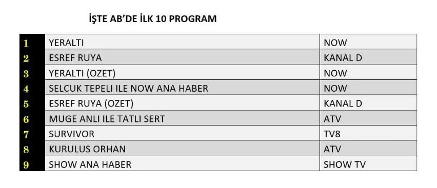 AB izleyici grubunda da 18 Şubat Çarşamba akşamının reyting tablosu netleşti. Kategoride “Yeraltı” dizisi zirveye yerleşerek birinci sırayı elde ederken, onu ikinci basamakta “Eşref Rüya” dizisi takip etti. Akşamın ön plana çıkan yapımının tekrar yayını olan “Yeraltı (Özet bölümü)” ise üçüncü sırada kendine yer buldu. Reyting sonuçları, dizinin hem yeni bölümüyle hem de özet yayınıyla AB grubunda güçlü bir izleyici karşılığı bulduğunu gösterdi.