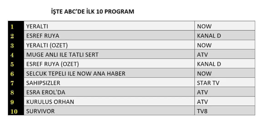 ABC1 izleyici grubunda da 18 Şubat Çarşamba akşamının reyting sonuçları dikkat çekici bir tablo ortaya koydu. “Yeraltı” dizisi bu kategoride de zirveyi kimseye bırakmayarak birinci sıraya yerleşti. Onu ikinci basamakta “Eşref Rüya” isimli sevilen dizi takip ederken, dizinin tekrar yayını olan “Yeraltı (Özet bölümü)” ise üçüncü sırada yer aldı. Bu şekilde ekranların yeni dizisi Yeraltı, hem yeni bölümü hem de özet bölümüyle ABC1 grubunda güçlü bir izlenme performansı sergilemiş oldu.