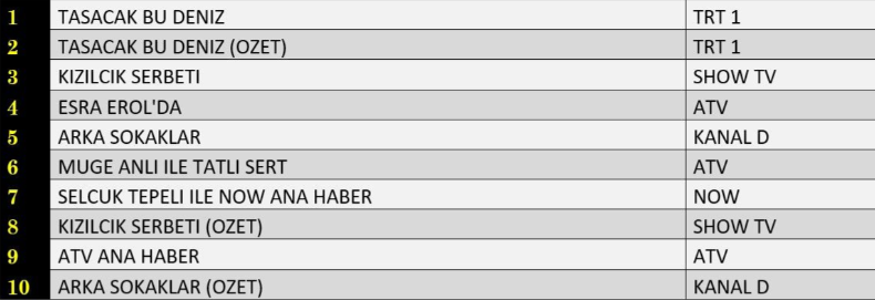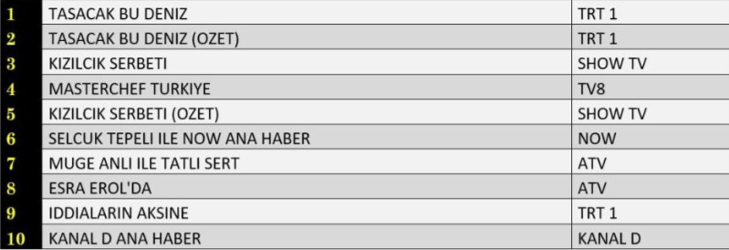 ABC1 reyting grubunda da tablo değişmedi. Güçlü hikâyesi ve artan izleyici ilgisiyle ekranların ilgiyle takip edilen dizisi “Taşacak Bu Deniz”, günün en çok izlenen yapımı olarak zirvedeki yerini korudu. Dizinin hemen ardından yayınlanan özet bölüm, yüksek izlenme oranıyla ikinci sıraya yerleşirken, uzun süredir gündemde olan ve sadık bir izleyici kitlesine sahip olan “Kızılcık Şerbeti” dizisi ise listeyi üçüncü sırada tamamladı.