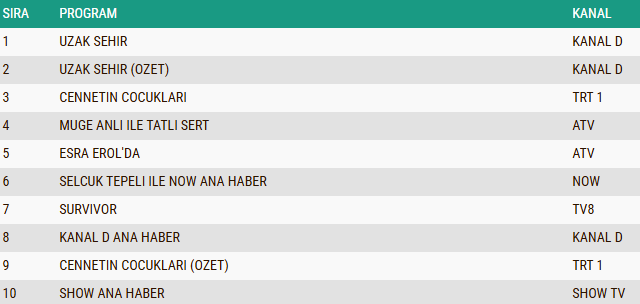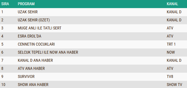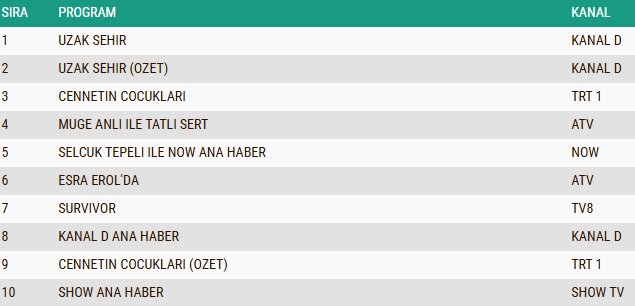 AB izleyici grubunda da lider değişmedi. İki sezondur yayınlandığı günden bu yana büyük ilgi gören “Uzak Şehir” dizisi, etkileyici bölümüyle günü birinci sırada tamamladı. Dizinin özet bölümü, ana bölümün ardından yüksek izlenme oranlarıyla ikinci sıraya yerleşti. Akşam kuşağında ekrana gelen “Cennetin Çocukları” dizisi ise istikrarlı performansıyla AB kategorisinde üçüncü sırada yer almayı başardı.