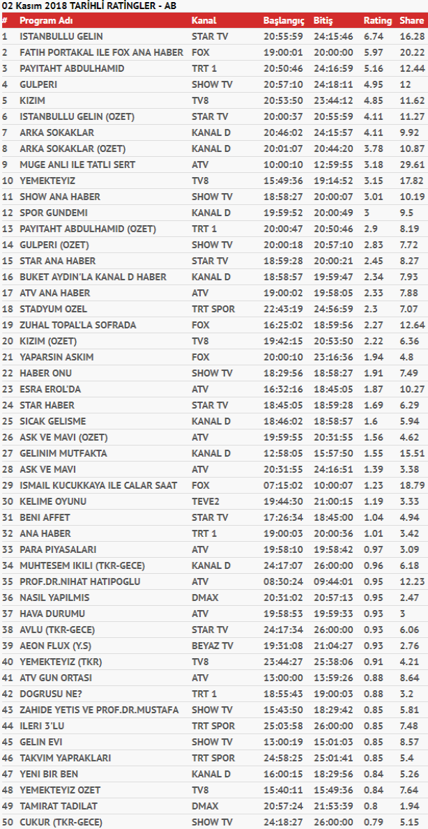 2 KASIM CUMA TOTAL REYTİNGLERİ