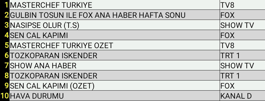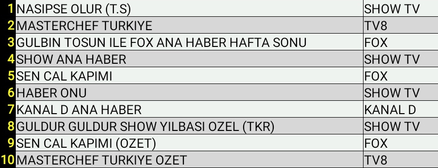 Total reyting kategorisinde dün en çok izlenen yapım Show TV'de ilk defa yayınlanan 'Nasipse Olur' filmi oldu. İlk final oyununun oynandığı MasterChef Türkiye ikinci, Gulbin Tosun ile Fox Ana Haber Hafta Sonu üçüncü, Show Ana Haber dördüncü, Sen Çal Kapımı ise beşinci sırada yer aldı. TRT 1'in yeni dizisi Tozkoparan İskender ilk 10'da yer alamadı.