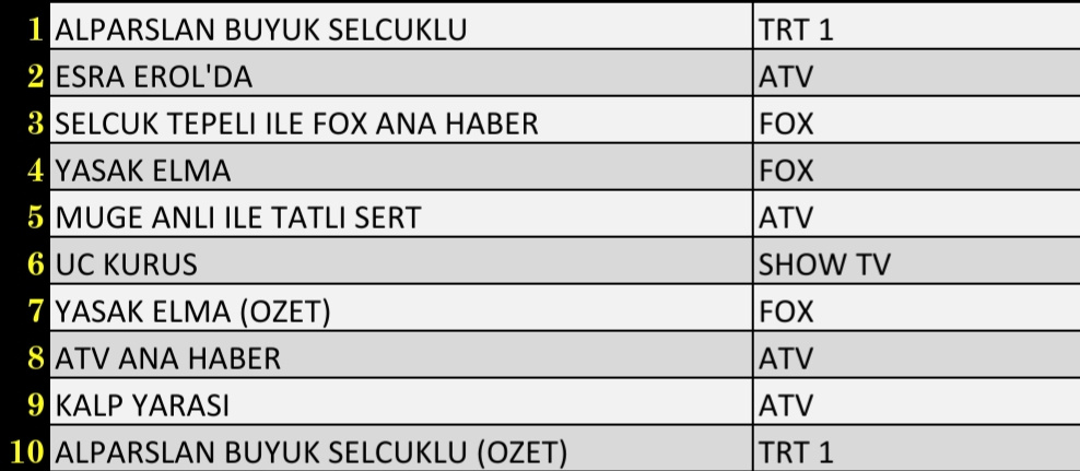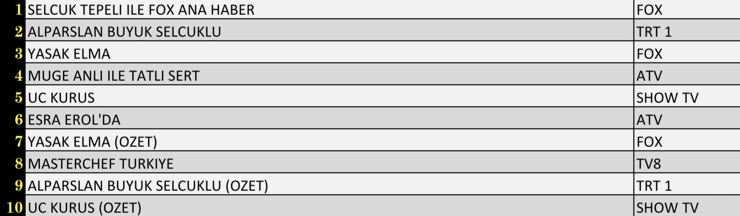 Total izleyici grubunda; TRT 1'in Alparslan Büyük Selçuklu dizisi günü birinci sırada tamamlayan yapım oldu. ATV ekranlarında yayınlanan Esra Erol'da programı listenin ikinici sırasına yerleşirken üçüncü sırayı da Selçuk Tepeli ile FOX Ana Haber kaptı. Fox TV'nin en entrikalı dizisi 'Yasak Elma' ise dördüncü sırada yer bulabildi.