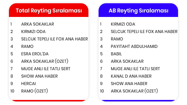 Total'de Kanal D'nin uzun soluklu dizisi 'Arka Sokaklar' günü birinci sırada tamamladı. Günün diğer dizileri 'Kırmızı Oda' ikinci, 'Ramo' dördüncü, 'Hercai' dokuzuncu sırada yer aldı. 'Çocukluk' ve 'Babil' dizileri ilk 10'da kendine yer bulamadı.