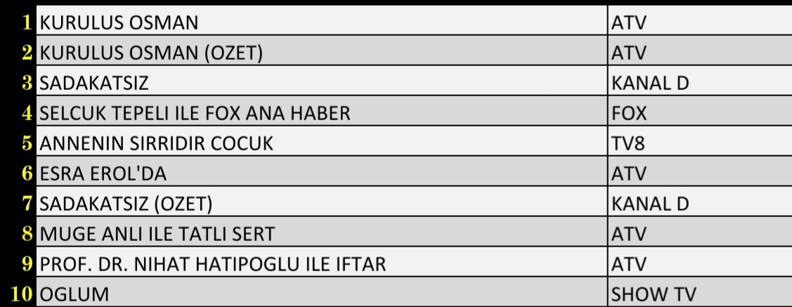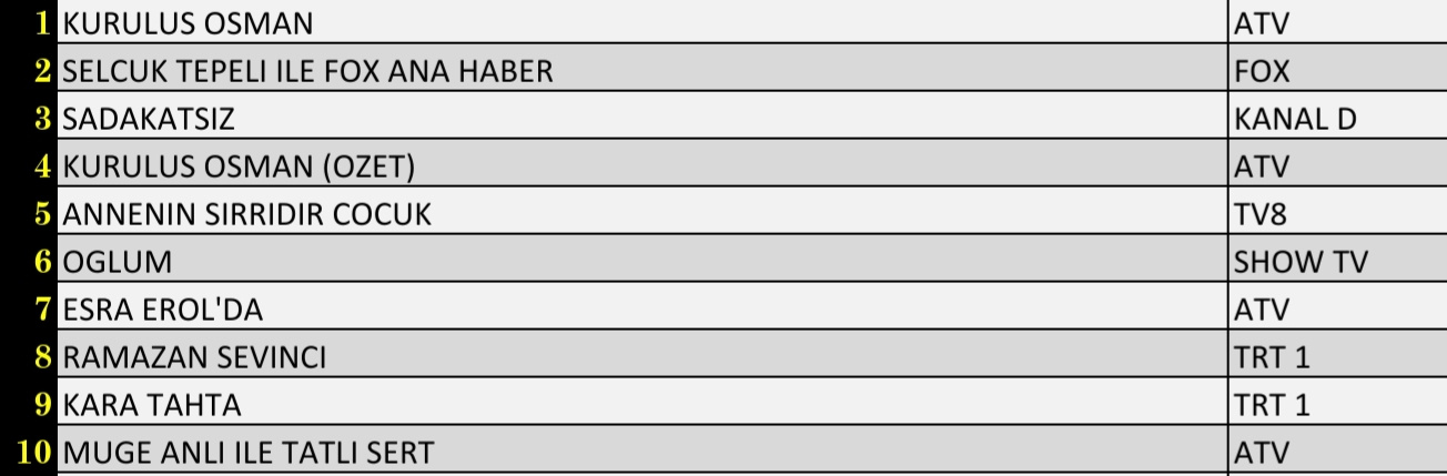 Total izleyici grubunda dün en çok izlenen yapım Atv'de yayınlanan 'Kuruluş Osman' oldu. 'Kuruluş Osman (Ozet)' ikinci, 'Sadakatsiz' üçüncü, 'Selçuk Tepeli ile Fox Ana Haber' dördüncü olurken 'Annenin Sırrıdır Çocuk' ise günü beşinci olarak tamamladı.