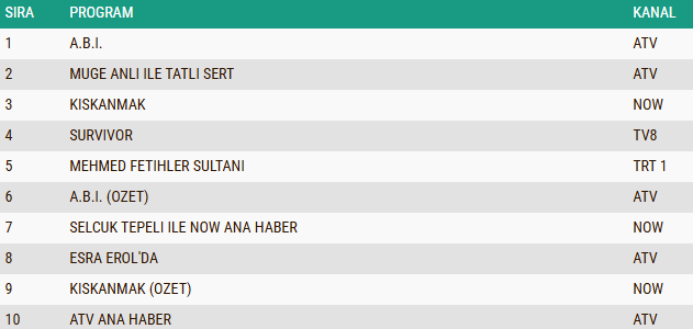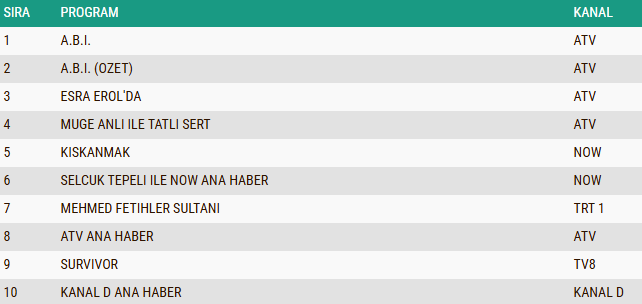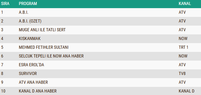 AB izleyici grubunda günün reyting sıralaması netleşti. Yayınlandığı saat boyunca dikkatleri üzerine çeken performans sergileyen “A.B.İ.” adlı yeni dizi, elde etmiş olduğu izlenme oranlarıyla listenin ilk sırasında yer alarak AB grubunda da liderliğini sürdürdü. Gündüz kuşağının uzun soluklu ve güçlü yapımlarından “Müge Anlı İle Tatlı Sert” sabah programı, izleyicinin ilgisini yine üzerine çekmeyi başararak ikinci sıraya yerleşti. Üçüncü sırada ise yayınlandığı bölümle adından söz ettiren “Kıskanmak” isimli dizi bulunurken, yapım AB grubunda günün en çok izlenen programları arasına girmeyi başardı.