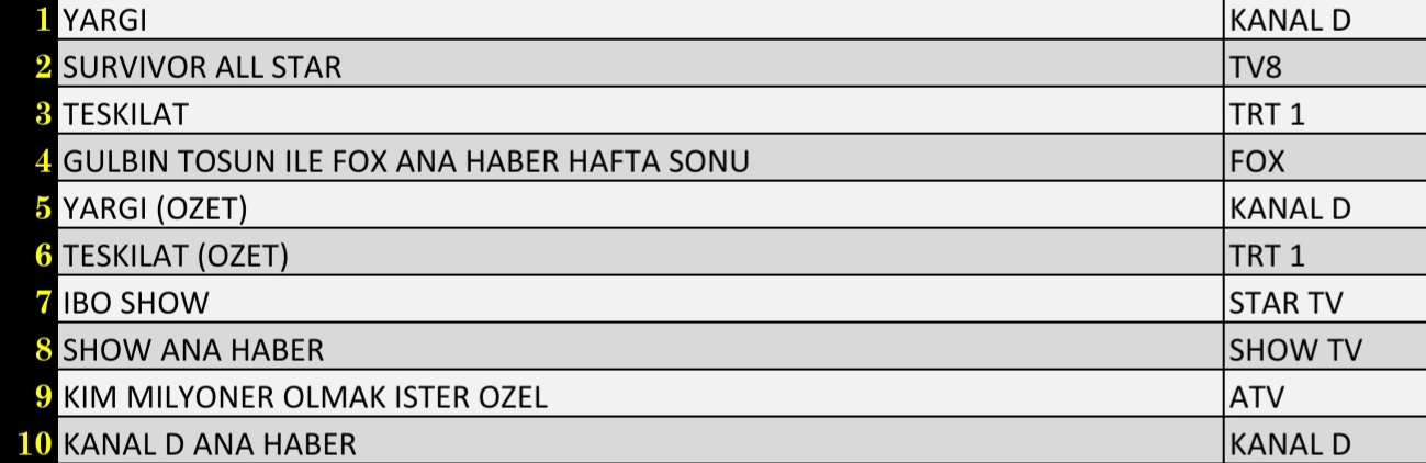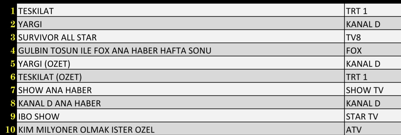 Total izleyici grubunda dün en çok izlenen yapım TRT 1 ekranında yayınlanan Milli İstihbarat Teşkilatı (MİT) temalı 'Teşkilat' dizisi oldu. Listenin ikinci sırasında Kanal D'de yayınlanan 'Yargı' dizisi yer alırken günün diğer çok izlenen programı 'Survivor All Star' ise listenin üçüncü sırasında günü tamamlayan yapım oldu.