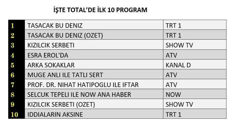 AB izleyici grubunda da tablo değişmedi ve akşamın en çok tercih edilen yapımı yine Taşacak Bu Deniz dizisi oldu. Sevilen dizi, hem hikâye akışı hem de karakter gelişimleriyle dikkatleri üzerine çekerek güçlü performansını bu kategoride de devam ettirdi. Onu, sadık izleyici kitlesini ekran başında tutmayı başaran Kızılcık Şerbeti dizisi takip ederken, yapımın tekrar bölümü niteliğindeki Taşacak Bu Deniz (Özeti) ise üçüncü sıraya yerleşerek listenin üst basamaklarında kalmayı başardı.