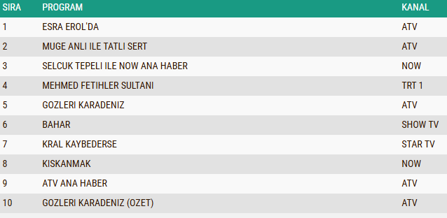 21 Ekim Salı günü, Türk televizyonlarında Total izleyici grubunda en çok izlenen yapım, ATV ekranlarının gündüz kuşağında yayınlanan ve gerçek hayat hikayelerini izleyici ile buluşturan "Esra Erol'da" programı oldu. Uzun soluklu başarısını azimli bir şekilde devam ettiren ve sunuculuğunu Esra Erol'un üstlenmiş olduğu program, yine geniş kitlelerce ilgiyle takip edilerek reyting listelerinde zirveye yerleşmeyi başardı. Konuya dair tüm detaylar haberimizde...