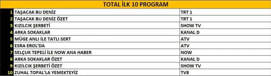 Total izleyici kategorisinde “Taşacak Bu Deniz” dizisi güçlü bölümüyle günün açık ara lideri oldu. Dizinin özet bölümü bile yüksek izlenme oranlarıyla ikinci sıraya yerleşerek dikkat çekici bir başarıya imza attı. “Kızılcık Şerbeti” dizisi ise istikrarlı performansını devam ettirerek üçüncü sıradan listeye girdi.