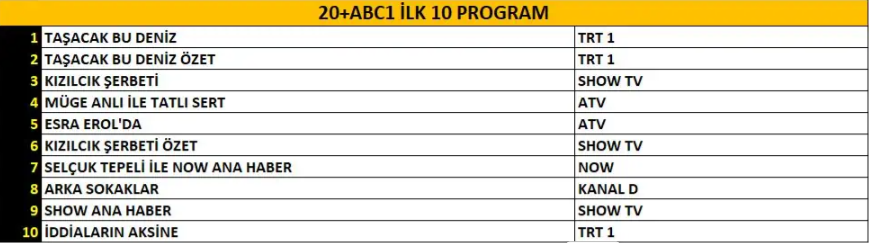 AB izleyici grubunda da “Taşacak Bu Deniz” dizisi üstün performansını sürdürerek günün lideri oldu. Dizinin özet bölümü, ana bölüm kadar ilgi görerek ikinci sıraya yerleşti ve yapımın geniş izleyici kitlesini bir kez daha kanıtladı. “Kızılcık Şerbeti” isimli fenomen dizi ise dengeli reyting grafiğiyle üçüncülük koltuğunda kendine yer buldu.