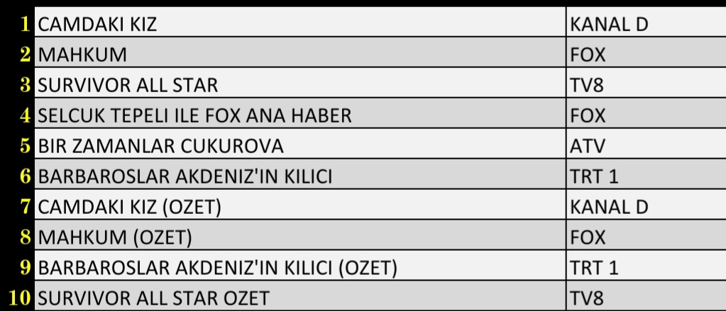 TİAK tarafından alınan karar doğrultusunda reyting sonuçlarını ilk 100 ve ayrıntılı olarak paylaşamıyoruz. O nedenle aşağıdaki tablolar üzerinden hangi yapımın hangi sırada yer aldığını ilk 10 sıralama olarak görebilirsiniz.