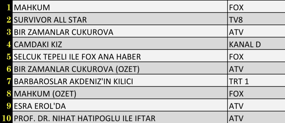 Total izleyici grubunda dün Fox TV ekranlarında yayınlanan Mahkum en çok izlenen olurken, TV8'de yine heyecan dolu dakikalar yaşatan 'Survivor All Star' ikinci oldu.  ATV'de yayınlanan Bir Zamanlar Çukurova ise üçüncü oldu. Listenin devamı ise şöyle oluştu; Camdaki Kız dördüncü, Selçuk Tepeli ile Ana Haber beşinci Barbaroslar: Akdeniz’in Kılıcı yedinci sıraya yerleşen yapımlar arasında oldu.