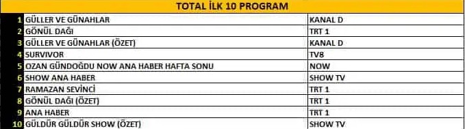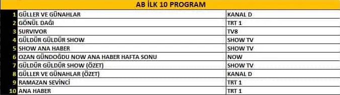 AB izleyici grubunda da zirve mücadelesi dikkat çekti. Listenin ilk basamağında, etkileyici senaryosu ve güçlü oyuncu kadrosuyla ön plana çıkan Güller ve Günahlar dizisi yer alarak başarısını bu kategoride de sürdürdü. Uzun yıllardır ekran yolculuğuna devam eden ve sadık izleyici kitlesini koruyan Gönül Dağı dizisi ikinci sırada kendine yer bulurken, rekabet dolu parkurları ve ada konseyleriyle izleyiciyi ekran başına kilitleyen Survivor yarışması programı ise üçüncü sırada günü tamamladı.
