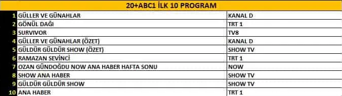 ABC1 izleyici grubunda da zirve değişmedi ve Güller ve Günahlar dizisi gecenin en çok izlenen yapımı olarak ilk sıradaki yerini aldı. Hem hikâye temposu hem de karakterler arasındaki güçlü çatışmalarla dikkat çeken yapımı, yıllardır cumartesi akşamlarının vazgeçilmezlerinden biri olmayı sürdüren Gönül Dağı dizisi ikinci sıradan takip etti. Listenin üçüncü basamağında ise rekabet dolu anları ve yüksek temposuyla ön plana çıkan Survivor yarışma programı yer aldı.