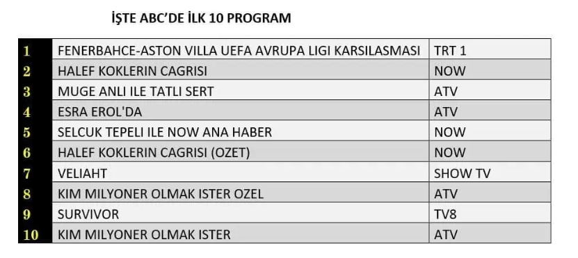 AB izleyici grubunda da 22 Ocak 2026 Perşembe gününün reyting lideri değişmedi. Futbol tutkunlarını ekran başına toplayan “Fenerbahçe-Aston Villa UEFA Avrupa Ligi Karşılaşması”, yüksek izlenme oranlarıyla AB kategorisinde de zirvenin sahibi oldu. Güçlü hikâyesi ve dikkatleri üzerine çeken anlatımıyla ön plana çıkan “Halef: Köklerin Çağrısı” dizisi, gecenin en çok izlenen ikinci yapımı olurken, gündüz kuşağının uzun soluklu ve istikrarlı programı “Müge Anlı ile Tatlı Sert” ise AB grubunda üçüncü sıraya yerleşti.