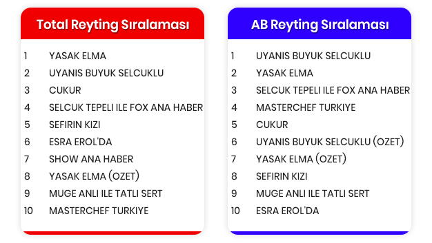 AB reytinglerinde ise geçen hafta olduğu gibi TRT 1 dizisi 'Uyanış Büyük Selçuklu' kategorinin en çok izleneni oldu. Total'de birinci sırada yer alan 'Yasak Elma' dizisi listenin ikinci sıradasında yer alırken, 'MasterChef Türkiye' dördüncü, 'Çukur' beşinci, 'Sefirin Kızı' ise sekizinci sırada günü tamamladı.