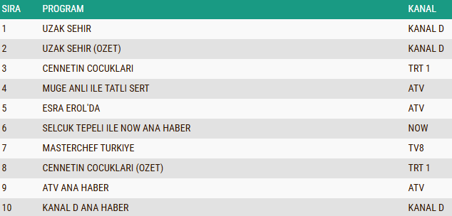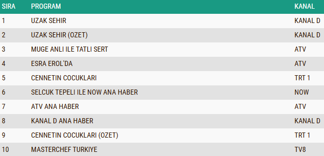Total grubunda gecenin kazananları belli oldu. Kanal D ekranlarında yayınlanan “Uzak Şehir” dizisi bir kez daha zirvedeki yerini sağlamlaştırdı. Dizinin özet bölümü ise güçlü bir performans göstererek ikinci sıraya yerleşti. Günün üçüncü sırasında ise izleyici kitlesini her bölümde genişletmeye devam eden “Esra Erol’da” yer aldı.