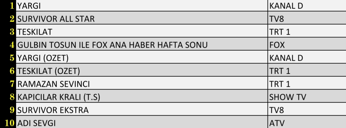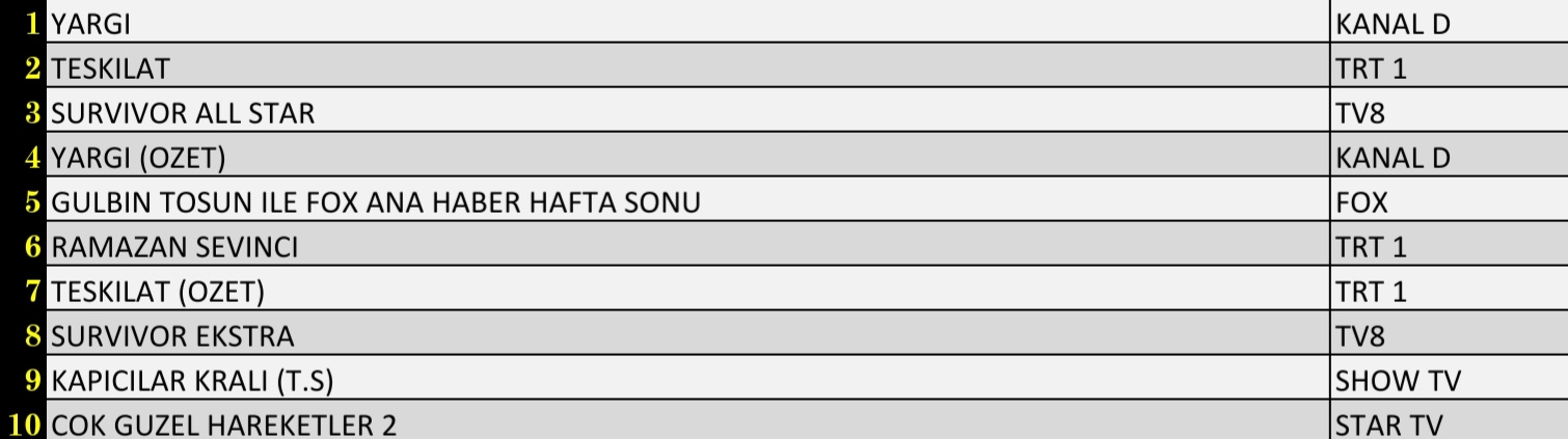AB izleyici grubunda listenin birinci sırasında Kanal D ekranlarının en sevilen dizisi "Yargı" birinci sırada günü tamamladı. "Teşkilat" ikinci, "Survivor All Star" dördüncü, "Gülbin Tosun ile Fox Ana Haber Hafta Sonu" beşinci sırada yer alan yapımlar oldu.