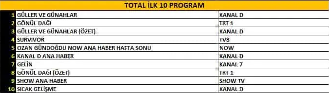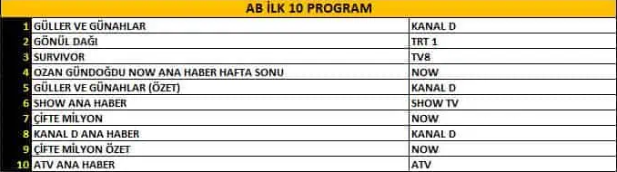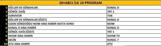 AB izleyici grubunda günün reyting sonuçlarına göre zirvenin sahibi, sürükleyici hikâyesi ve güçlü oyunculuklarıyla dikkatleri üzerine çeken dizi “Güller ve Günahlar” olurken, uzun süredir istikrarlı performansıyla ön plana çıkan ve samimi anlatımıyla geniş bir izleyici kitlesine hitap eden “Gönül Dağı” dizisi ikinci sırada yer aldı; rekabet ve heyecanın eksik olmadığı bölümleriyle her sezon ilgiyle takip edilen “Survivor” yarışma programı ise AB kategorisinde üçüncü sıraya yerleşerek günün en çok izlenen yapımları arasındaki yerini korudu.
